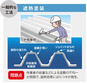 一般的な工法で遮熱塗装がありますが、作業者の技量などによる塗膜の不均一が原因で遮熱効果にばらつきが発生することがありました。