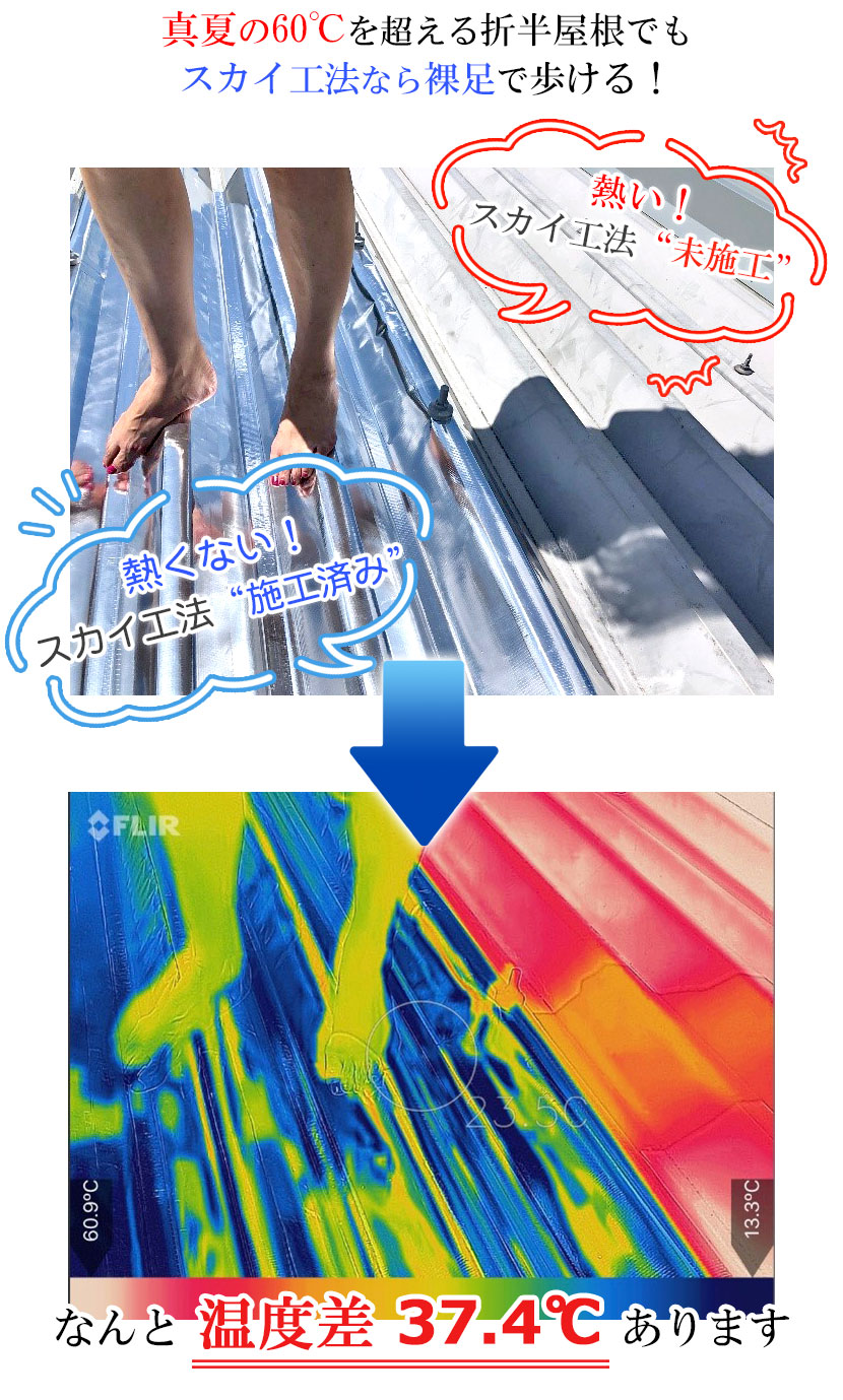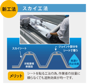 一方、遮熱塗装の課題を解決した新工法であるスカイ工法では、シートを貼る工法遮熱塗装の課題に対応する新工法の為、作業者の技量に頼らなくても遮熱効果が均一です。